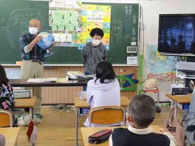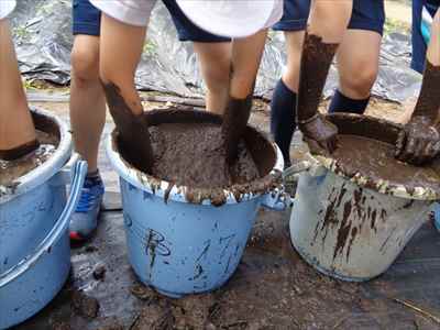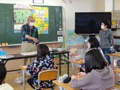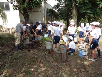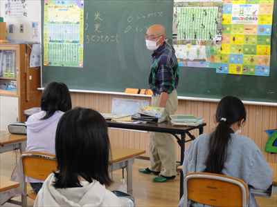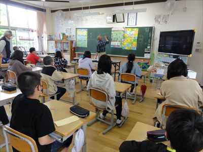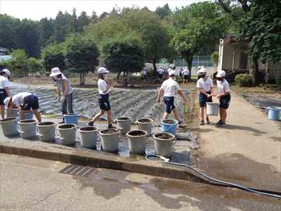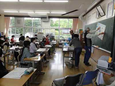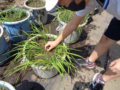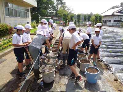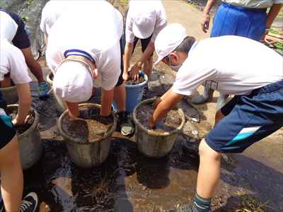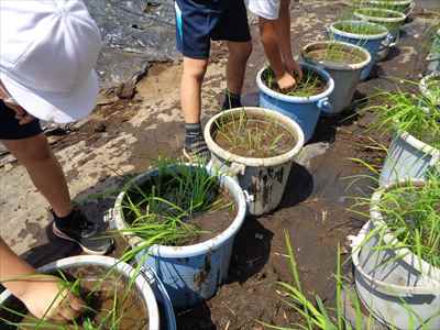 5年生は、総合的な学習の時間の授業で、「日本の主食である米や野菜を育てて料理を作ろう」をテーマに学習活動に取り組んでいます。学校支援ボランティアティーチャーの上野長一先生ご夫妻、水谷正一先生にご指導をいただきながら、種から苗に育つまでに大切なことやバケツを使った田植えなど、米づくりの特徴を理解したり、田植え体験をしたりして貴重な時間を過ごしました。子どもたちは、分からないことや疑問に思ったことなどを学校支援ボランティアティーチャー上野長一先生に聞いて解決していました。種から苗に育つまでの学習をしている様子バケツを使った田植えを体験している様子