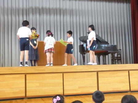 夏休み前の最後の集会となりました。夏休みの学習や生活について,担当の先生から話を聞きました。また,この日は,落合先生とのお別れの会でもありました。落合先生には,算数や理科などを教えていただきました。ありがとうございました。