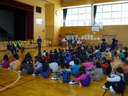 日頃お世話になっている交通指導員さんとスクールガードさんへの感謝の会を行いました。感謝の気持ちを込めて、歌(グッデイ・グッバイ)やメダルなどのプレゼントを送りました。あいさつの大切さや交通安全などについて、お話をいただきました。