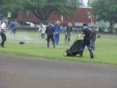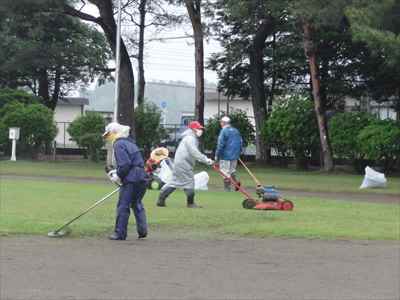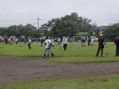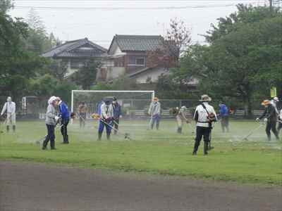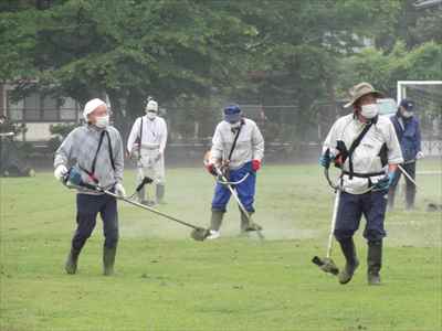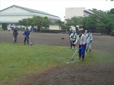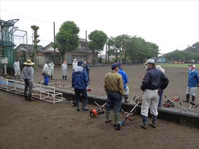 先月、本校の学校運営協議会において、子どもたちが運動会で全力をだせるよう、運動会前に環境整備ボランティアの協力をお願いしたところ、学校運営協議会委員でもある地域コーディネーター代表の方が中心となって呼びかけていただき、37名の地域の皆様方が参加してくださいました。 5月21日(金)、地域の皆様方に校庭の芝刈り、草刈りをしていただき、校庭一面を整備することができました。本校が目指す学校像でもある“地域とともにある学校” “緑豊かな美しい学校”が、皆様方に支えられていることにあらためて感謝申し上げます。 地域の皆様方には小雨の中、子どもたちのために早朝から作業をしていただき、ありがとうございました。環境整備をしていただいた皆様方と、そのようすを掲載しましたのでご覧ください。地域コーディネーター代表の方のあいさつと作業場所を確認している様子。校庭の芝刈り、草刈りをしている様子