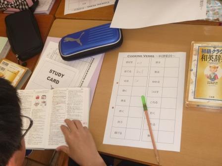 今日の5年生の外国語活動の授業は、「混ぜる」「茹でる」「切る」など、料理をするときの動作の英語表現を学習しました。