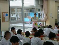 町学校給食センターから学校栄養士の方が来校し、給食の時間に食と健康の話をしてくださいました。育ち盛りの子どもたちにとってとても大切な話を、わかりやすく話してくださいました。