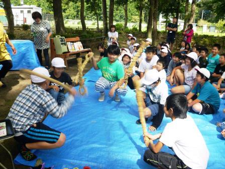“わらでっぽう”をやってみました。“わらでっぽう”は本地域の伝統行事でもあり、実際に育成会などで各戸を回っている子どもたちもたくさんいます。