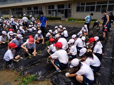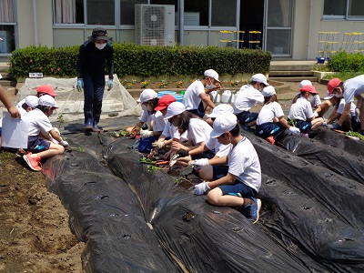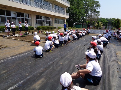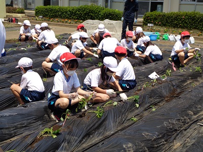 説明を聞いた後は、縦割り班に分かれて苗を植えました。高学年の児童が低学年の面倒をよく見ていました。