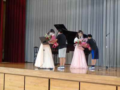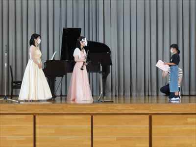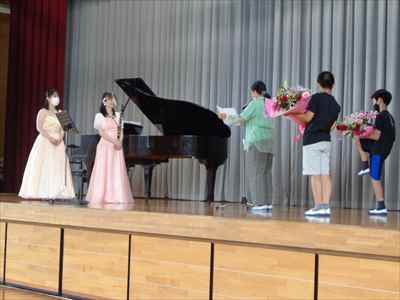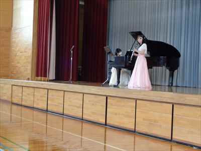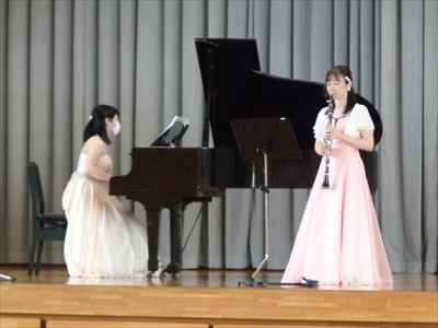 6月25日(金)、音楽鑑賞会を実施しました。優れた音楽を鑑賞することにより、豊かな情操を養えるよう目指しました。今回は、ピアノ演奏者の高鳥 舞先生、クラリネット演奏者の飯塚美由記先生をお招きして、3校時に1・2・3年生、4校時に4・5・6年生が参加しました。子供たちは、二人の先生方が奏でる音色に聞き入っていました。