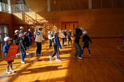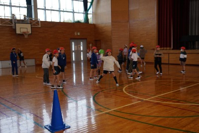 縦割り班による共遊(ドッヂボール)を行いました。1年生はダンボールで作成した盾となる『シールド』を使いながら参加しました。